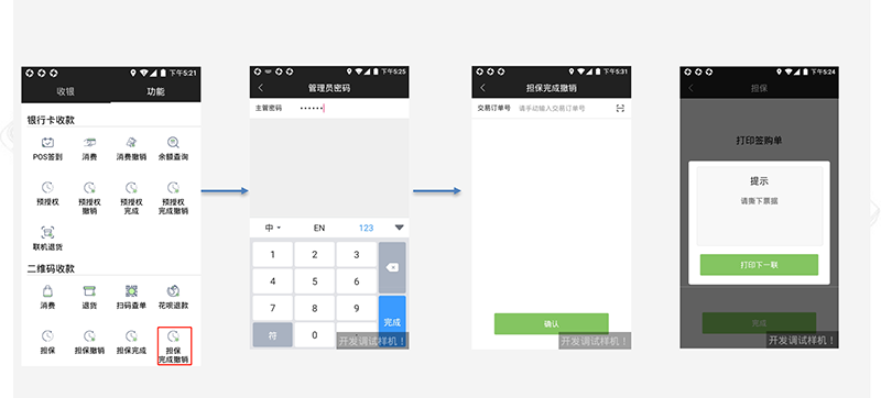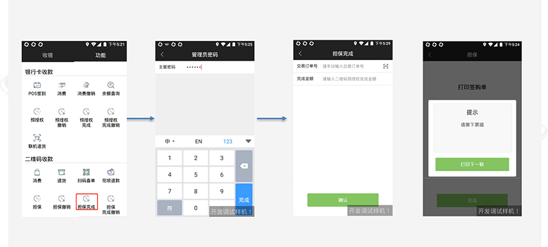 1、收銀臺進入“功能”列表, 點擊機擔保完成 2、輸入管理員密碼 3、輸入小票上的訂單號以及 完成金額 4、擔保完成交易