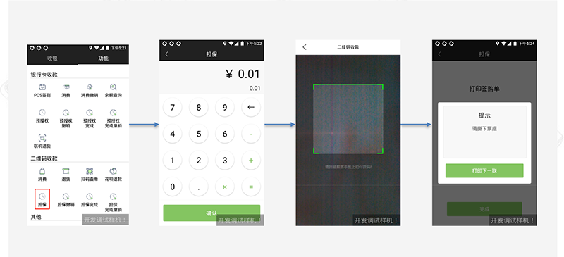 1、收銀臺進入“功能”列表, 點擊擔保 2、輸入擔保金額 3、掃碼微信/支付寶付款碼 4、擔保交易完成