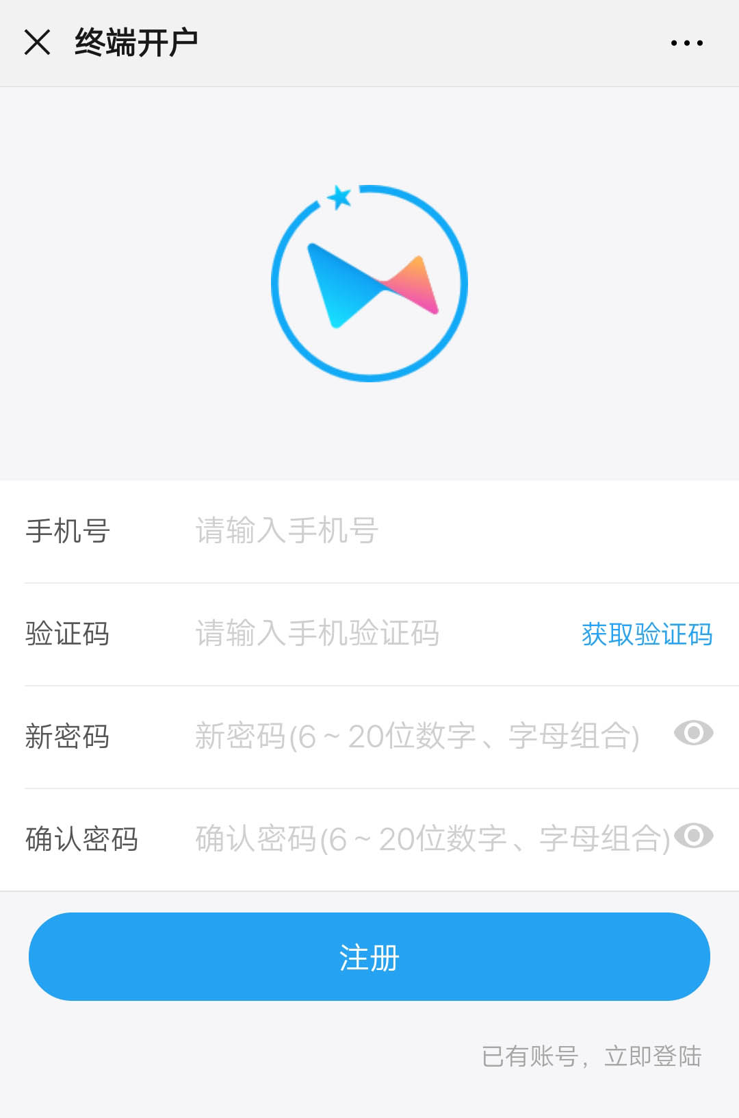 三:進(jìn)入注冊(cè)頁(yè)面,輸入注冊(cè)手機(jī)號(hào)獲取驗(yàn)證碼,在依次輸入設(shè)置登陸密碼,點(diǎn)擊注冊(cè)(這里設(shè)置的手機(jī)號(hào)和密碼是星pos管家APP的登錄名與密碼)