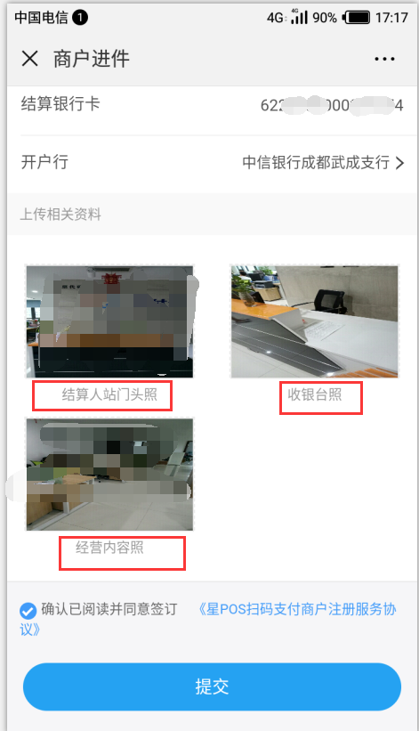 4、依次上傳結(jié)算人站門頭照、收銀臺(tái)及經(jīng)營(yíng)場(chǎng)所照。