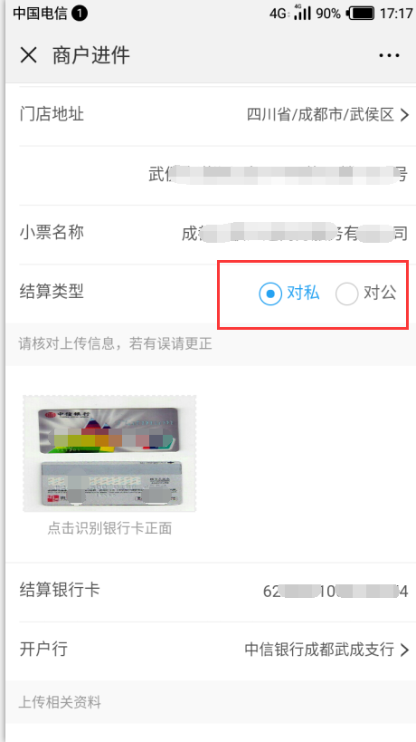 3、依次填寫(xiě)門店地址、小票;結(jié)算類型可選擇對(duì)公或者對(duì)私。上傳銀行卡后自動(dòng)識(shí)別卡號(hào),請(qǐng)核實(shí)是否正確。開(kāi)戶支行只能選擇!不能搜索。