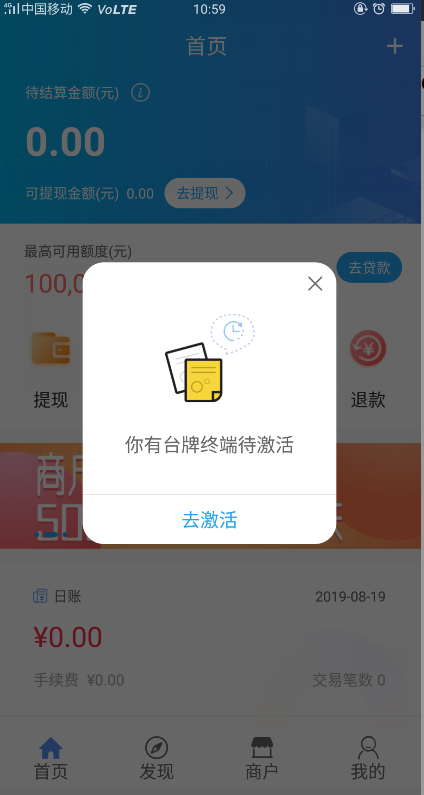 1、登陸后進(jìn)入首頁(yè):如有未激活的臺(tái)牌可根據(jù)提示去綁定臺(tái)牌